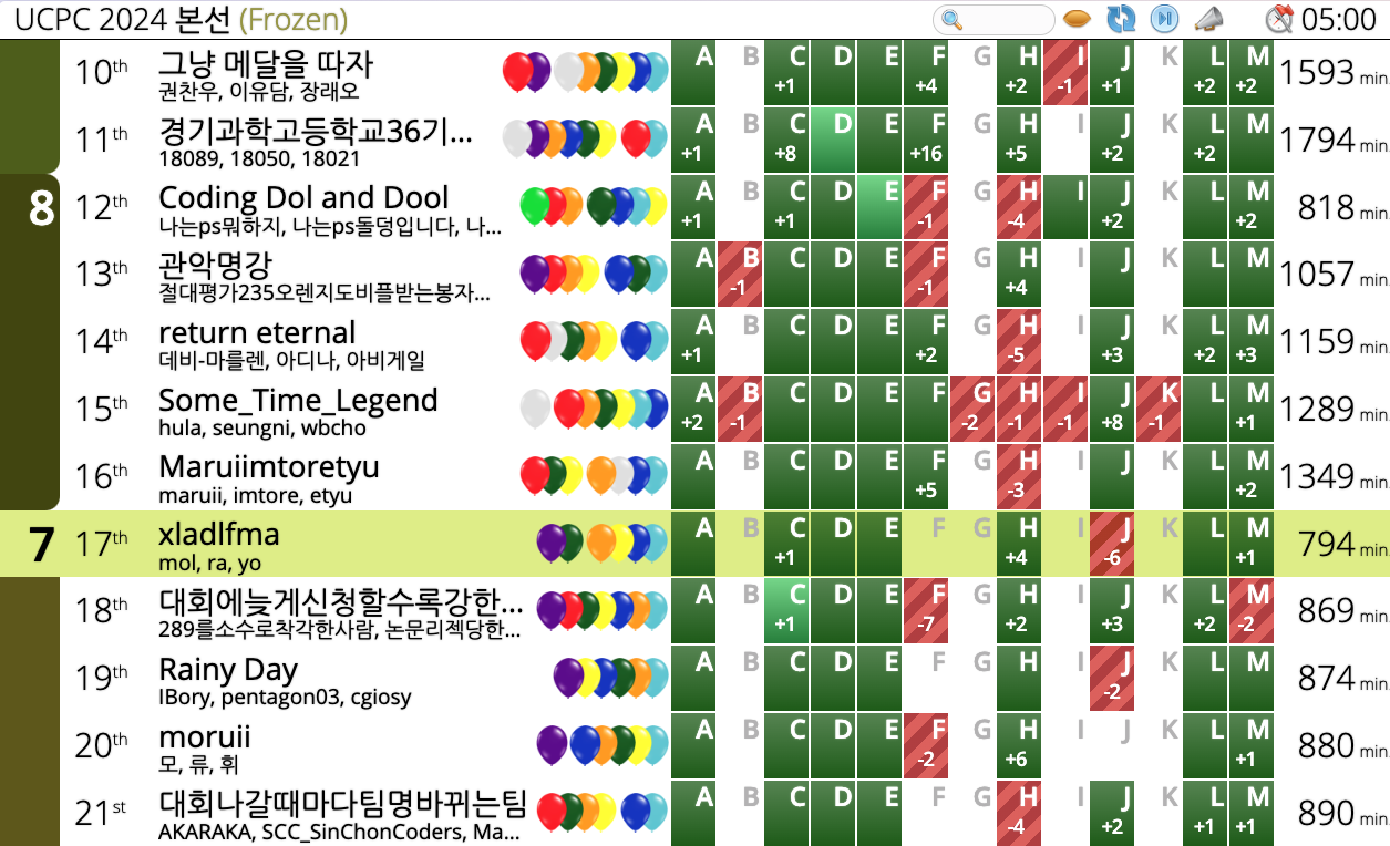 끝나고보니 올솔이 5팀이나 됐다. 그래서 6등이 됐다. 생각보다는 쉬운 문제라던데 흠 잘 모르겠다.