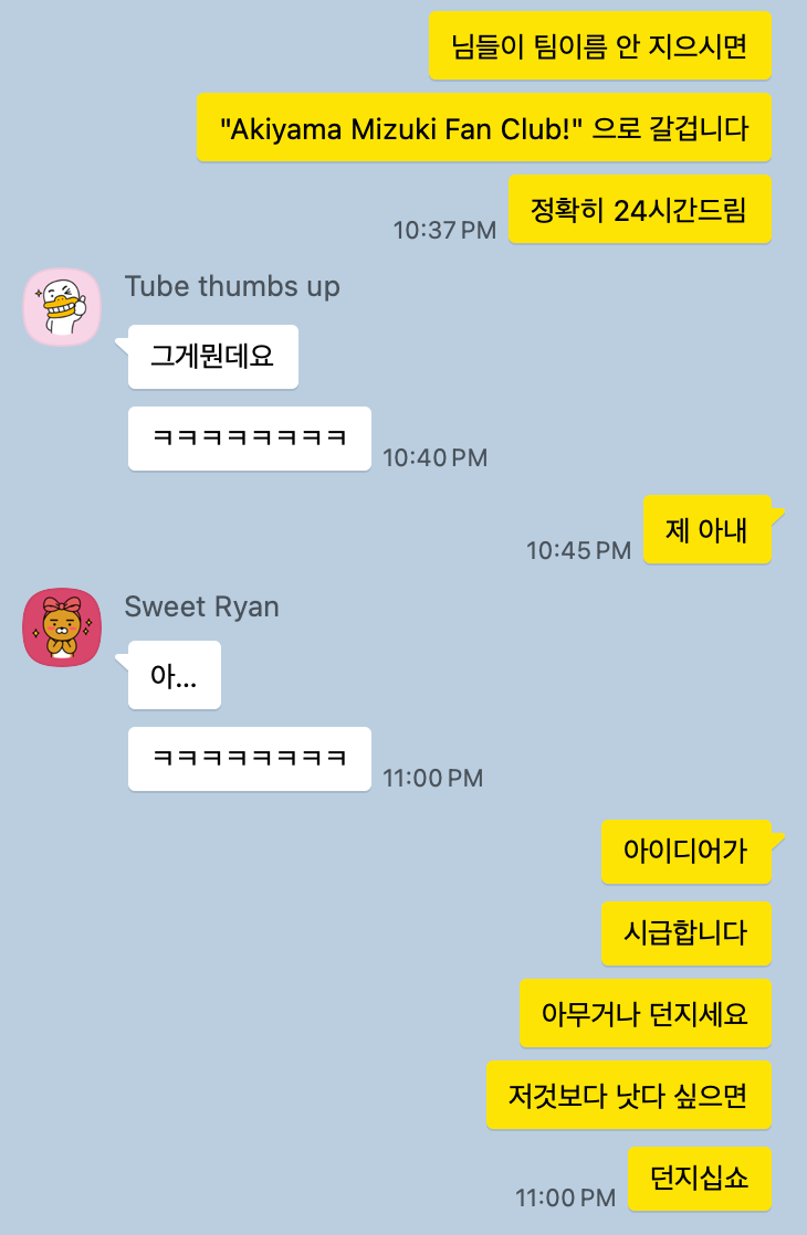 분명히 "Akiyama Mizuki Fan Club!" 보다 나은 팀명이 있다면 24시간 내에 알려달라고 했는데