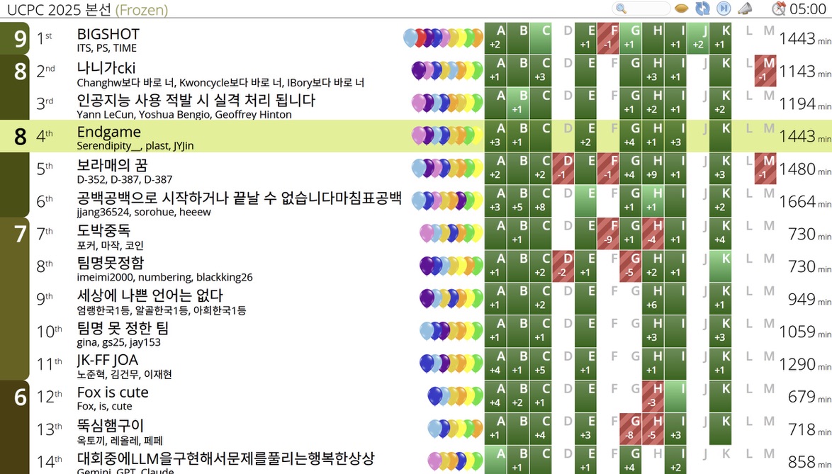 2025년 7월 26일에 UCPC 2025 본선에 참가했습니다. 팀명은 Endgame으로, 작년과 완전히 같은 멤버로 한번 더 icpc까지 도전할 예정입니다. 팀원은 JyJin, plast, Serendipity__입니다.