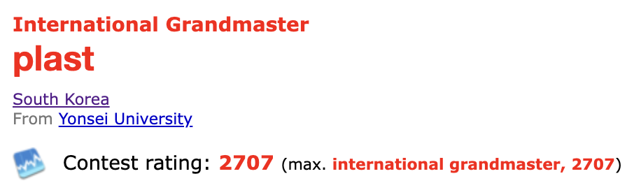 - Codeforces Max rating 2707 (작성일 기준 현역중 한국 전체 10등 + 11등)