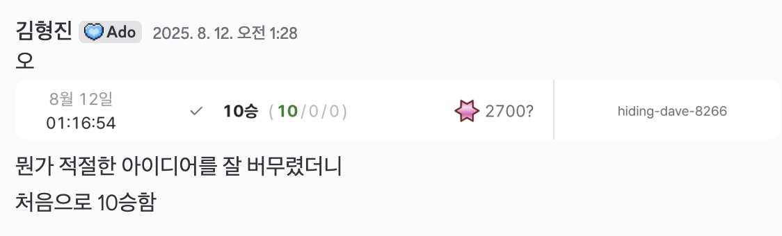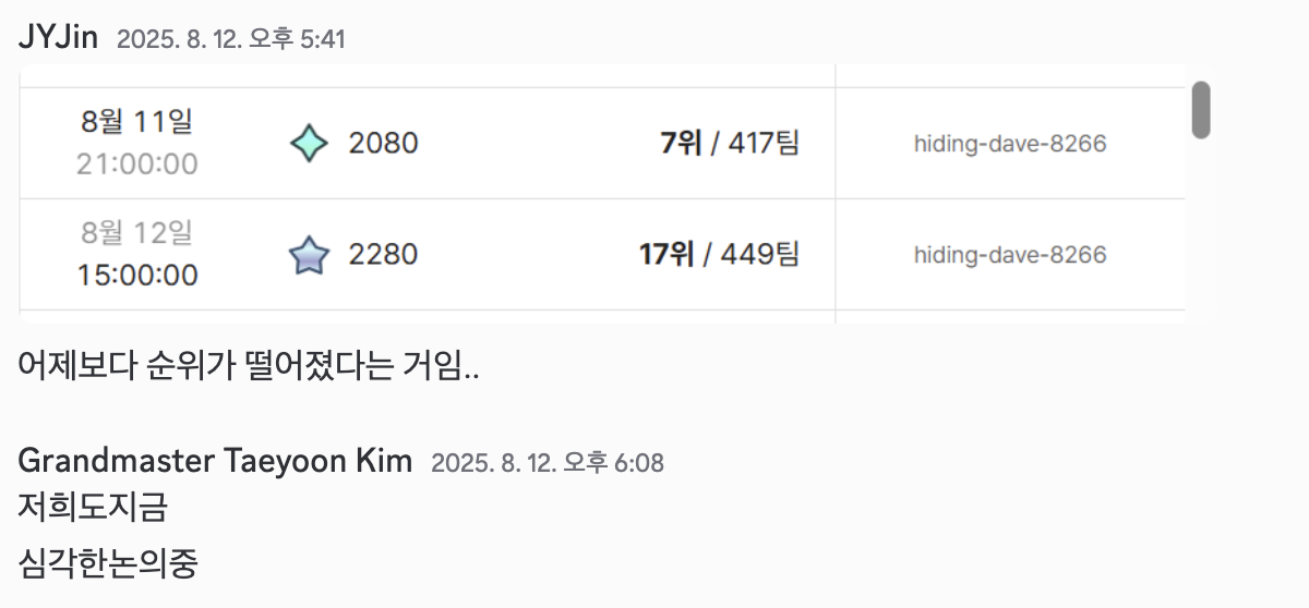 그런 의미에서 올해 팀은 예년과 꽤 달랐다. 특히 이전과 달랐던 점은, 내가 못하는 날에도 팀 전체의 성과가 크게 흔들리지 않았다는 것이다. 예전에는 내가 조금만 막히거나 템포가 느려져도 팀 전체가 같이 무거워진다는 감각이 있었는데 올해는 전혀 그렇지 않았다. 이런 경험이 몇 번 쌓이다 보니 무의식중에 팀원들에 대한 단단한 신뢰가 생겼고, 덕분에 실전에서도 예전보다 훨씬 편한 마음으로 대회에 임할 수 있었다. 스스로 내 실력이 많이 올라왔다는 확신도 있었기에 대회 전부터 큰 걱정은 없었고, 결과적으로도 그 감각은 크게 틀리지 않았다.