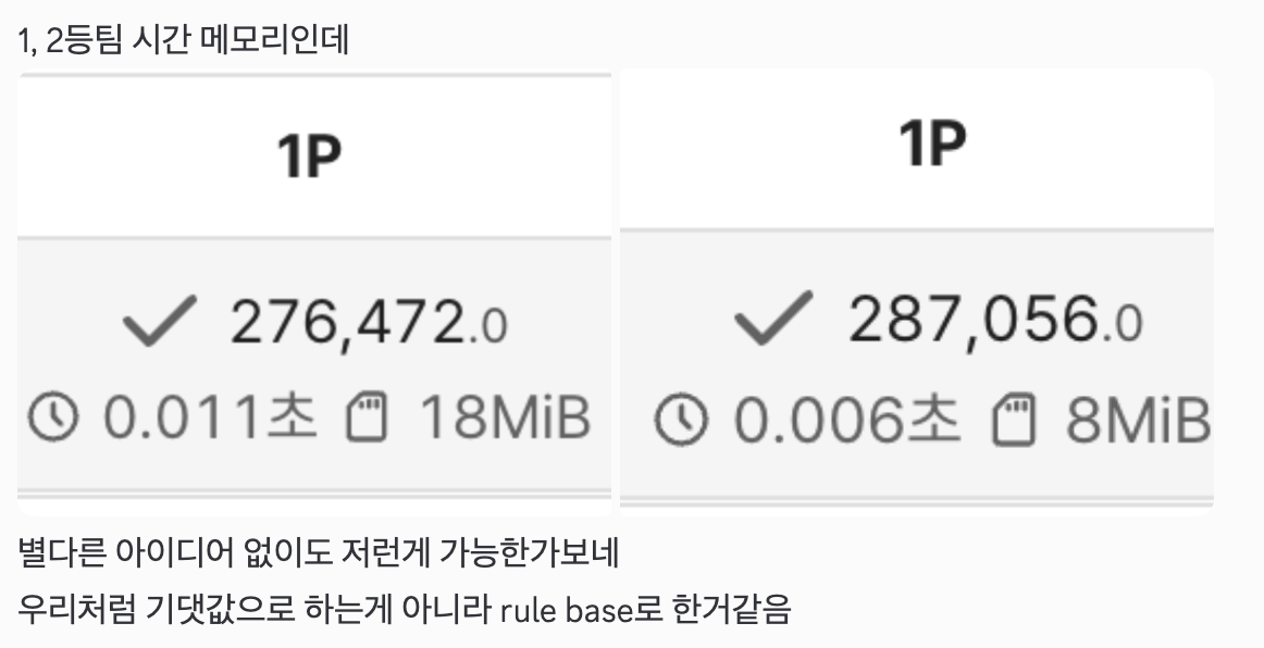 반면, 다이아 중상위권 문제들에 대해서는 평소 연습 때와 비슷한 결과가 나왔다. 가끔 그리디나 애드혹 계열 문제를 뚫어내는 경우를 제외하면, 이 난이도 구간의 문제를 팀 차원에서 시원하게 풀어낸 적은 원래도 많지 않았고 이번에도 마찬가지였다. 애초에 문제 셋 자체가 우리 팀의 상성과는 썩 잘 맞지 않았던 것 같다.